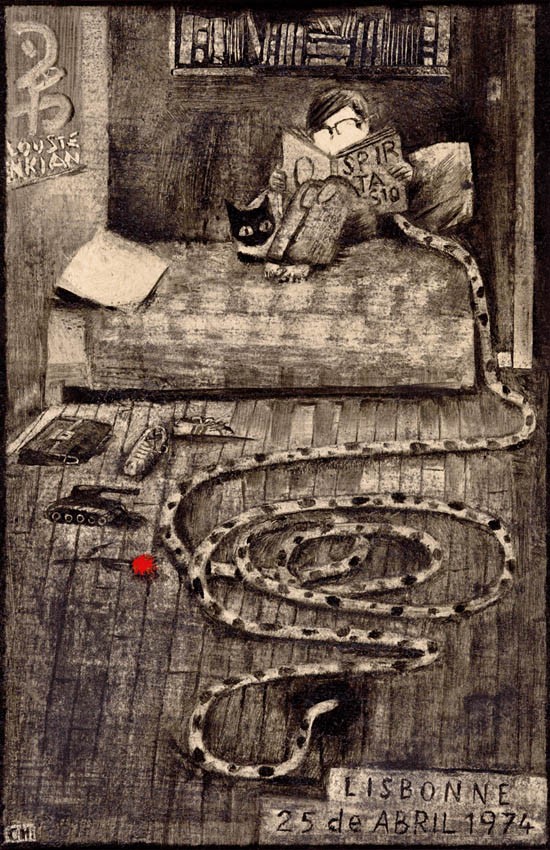 A cause de la révolution. O povo / unido / jamais sera vincido… Il y a des chars dans la rue et la télévision diffuse en boucle la chanson Grandola villa morena. J'ai sept ans et n'y comprends pas grand-chose. J'en profite surtout pour relire un de mes Spirou. Un avec le marsupilami. Le bonheur, c'est pour maintenant."
